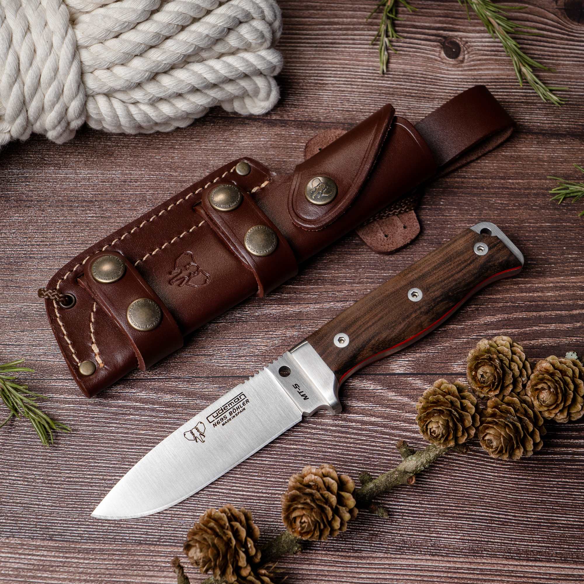 El Cudeman MT-5 es el cuchillo más famoso de la marca. Este diseño encabeza la lista de los más vendidos ya que fue, es y seguirá siento un top ventas a nivel mundial. Su diseño es único y el equilibrio de pesos es perfecto. Este modelo empezó a comercializarse en el año 2012 y desbancó a su predecesor en ventas, el histórico Cudeman MT-1. Este modelo ha sufrido cambios importantes en su acero, diseño y en la misma funda de cuero. Actualmente se fabrica en acero Böhler N-695. Es de estructura enteriza y cuenta con virolas de acero A-304 satinadas. Su mango es de madera natural de nogal con separadores rojos y consta de pomo percutor en el extremo final de su empuñadura. En la mesa de su hoja y en el mismo pomo percutor, tiene dos pasadores para poder crear una lanza con un cordón de seguridad. La cremallera en su lomo hace que el agarre sea seguro y fiable. Además su funda multiposición con trabillas y remaches hace que lo pueda portar tanto vertical como horizontal e incluir el adaptador para piedra y pedernal. El diseño de esta funda fue la inspiración inicial para crear fundas similares como la de los modelos Entresierras ó Ent. El mítico MT-5 pero con cachas de nogal natural para los coleccionistas más exigentes.